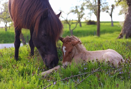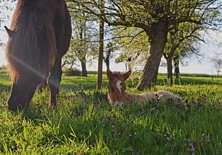 Unsere Lù ist im April 2023 geboren. Freilaufend zeigt sie alle Gänge, bevorzugt Tölt. Lú präsentiert auch immer wieder Pass auf der Weide.